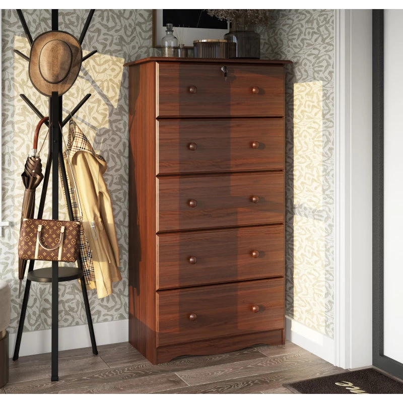 It’s a solid wood giant ‐ there is no other way to describe this 60 inch tall solid wood chest! Practically indispensable in small apartments and some houses‚ it holds a ton of stuff on a small footprint. Very deep super jumbo drawers will tuck away a heap of your belongings! A locking top drawer will keep your private things private and other items away from the kids. Available in 5 popular finishes, it will match most interiors.