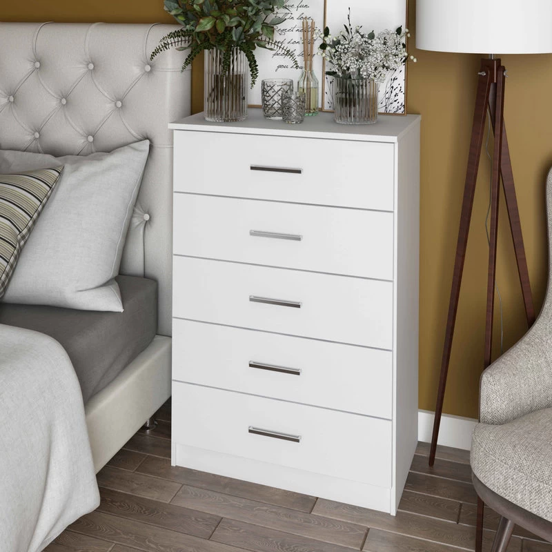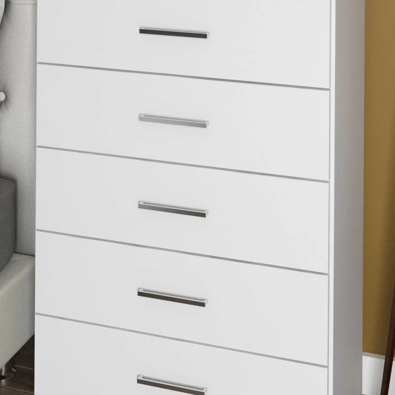 You would not expect a modern chest to be made of solid wood as very few are. But here it is ‐ a 100% solid wood marvel with all the accoutrements you’d expect from the style: simplicity‚ straight lines‚ metal accents. Surely it’s also a practical chest with spacious 5 drawers intended to make your living space clutter-free. Here modern design meets modern colors and there are 3 to choose from.