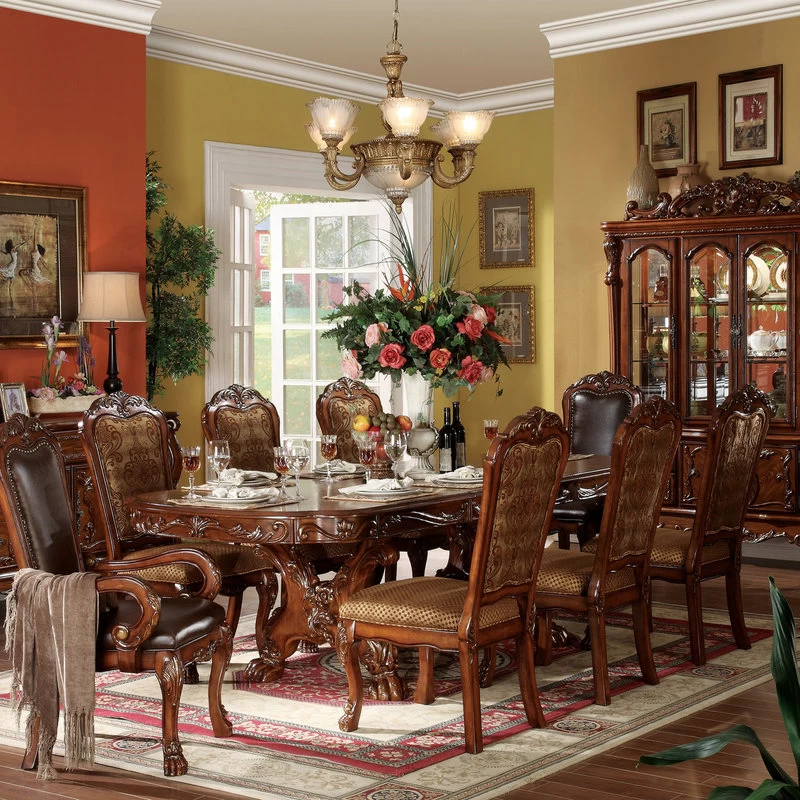 The Dresden traditional collection reflects highly decorative details, pedestal table, oversized claw feet, shaped top and decorative carving inlay veneers on apron. The dining chairs reflect carefully selected wood carving and upholstery in a symphony of material. Matching hutch & buffet reflects all carefully selected design features as the dining collection. This collection will be the showpiece of your dining room environment.