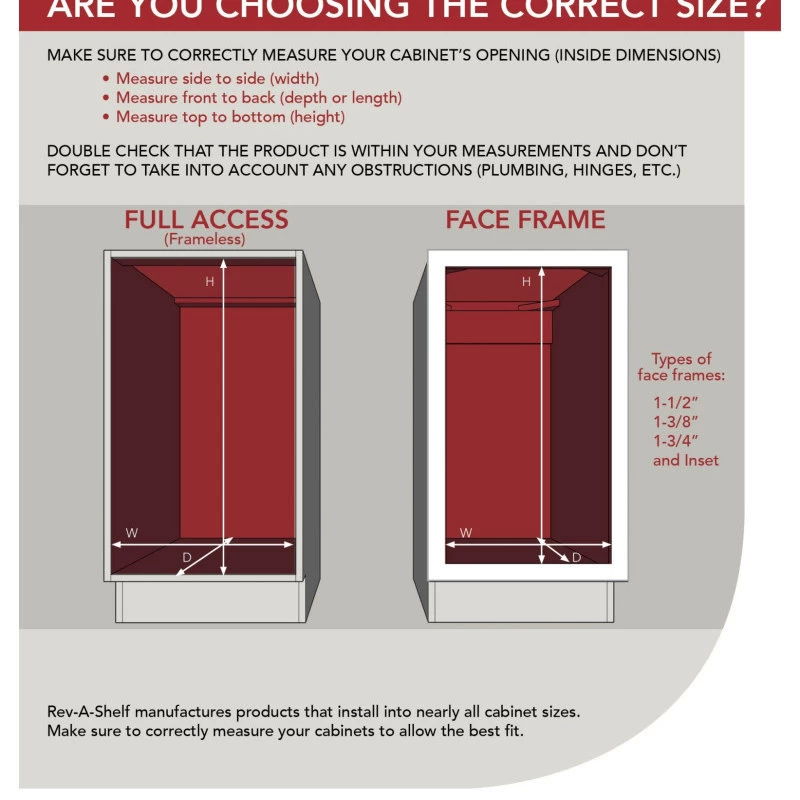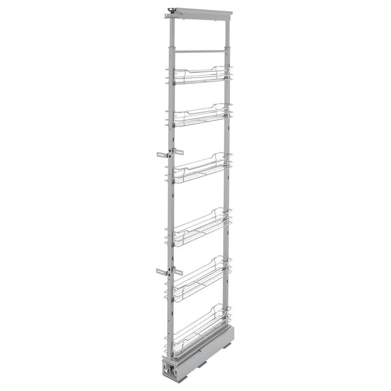 Enhance functionality and preserve a stylish image with the Rev-A-Shelf’s Chrome Pullout Pantry. The 5700 CR Series is available in a plentiful selection of sizes and is designed on the 250 lb. rated slide system for a quiet glide out function. This accessory features micro-adjustment door mounting brackets and top and bottom slide covers for a finished look. The chrome pullout pantries are kit packaged with frame, baskets and door mounting brackets in one carton.