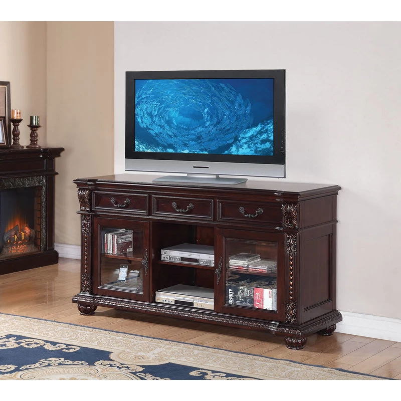 Bring elegance to the entertainment room with the Anondale TV Stand. This TV stand is made from durable poplar wood and is fashioned in a wonderful cherry finish. For your storage needs, this piece features 3 drawers, 2 glass doors and 1 shelf.