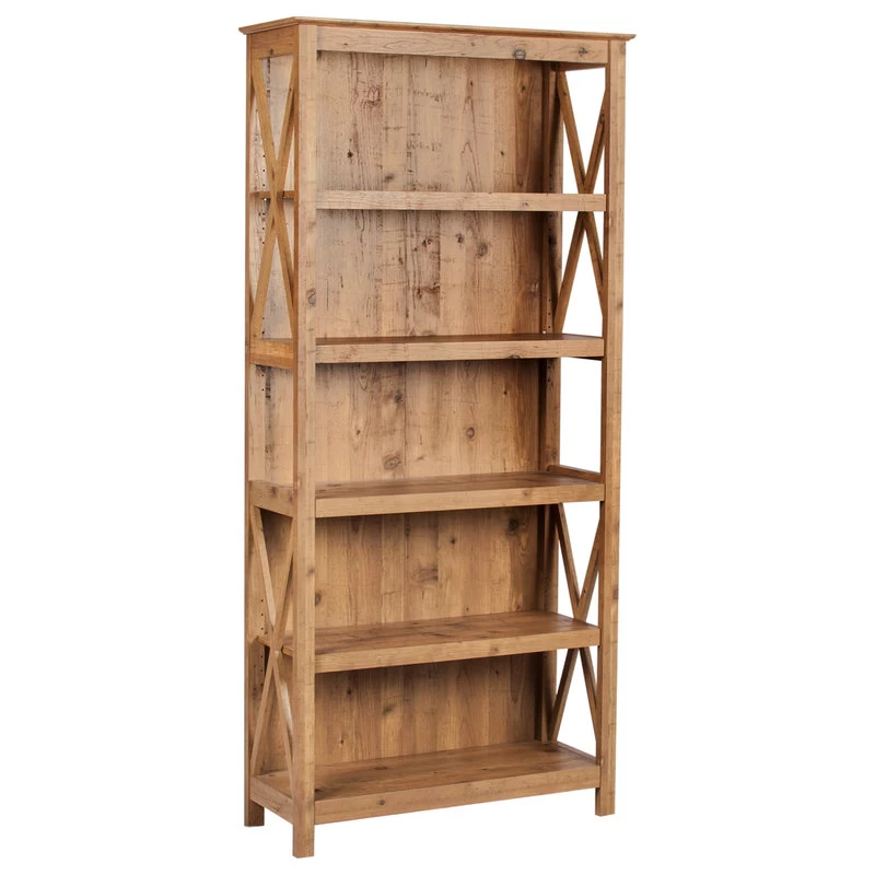 Add to the country-inspired charm of a casual space with this five-tier bookcase, a tasteful element perfect for use in a bedroom, home office, or main living area. This delightful bookshelf is given a rustic brown finish with natural-looking wood knots that lend authenticity. Open sides with cross-bar trim deliver stylish ambiance and security to keep books and decor in place. Find plenty of space on five separate shelves, and rest easy with the use of an included tip-over restraint kit.