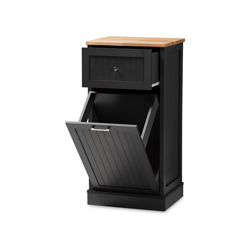 The Marcel kitchen cabinet is the simple solution you’ve been needing to maximize your kitchen and dining room space. The Marcel’s clean, simple coastal and farmhouse-inspired design will add charm to any kitchen and dining area. The oak-finished, thick wooden top offers a convenient prep and serving surface, or a place to keep a microwave or other kitchen appliances. The Marcel features a drawer for storage and a delightfully paneled pull out garbage compartment for even more convenience. The paneled design continues on each side of the cabinet, as well as the face of the drawer. The Marcel’s drawer knob and compartment handle are finished in chrome, complementing the colors of the cabinet. The dark Gray finished engineered wood frame makes this charming kitchen cabinet a breeze to coordinate with your existing kitchen and dining room decor. Made in Malaysia, the Marcel requires assembly.