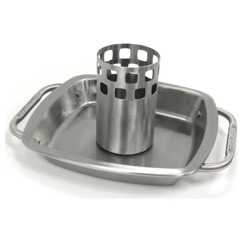 The Stainless Steel Chicken Roaster With Pan offers a premium accessory for use with your grill. The Broil King Imperial chicken roaster is crafted entirely of stainless steel with heavy 9- by 9-inch base and oversized 10mm handles for proven durability. The twist on the beer can holder has a large enough capacity to replace the beer can entirely and is vented at the top for better steaming action to help you get even more use out of your grill.