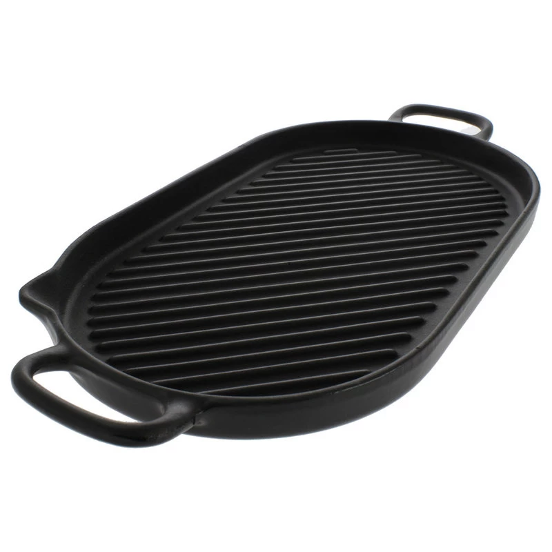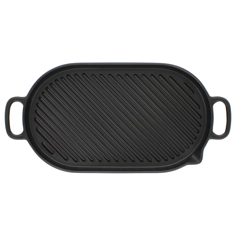 The Chasseur Oval Cast Iron Grill provides all the flavor of an outdoor grill, with all the convenience of indoor cooking. This grill pan is constructed of thick cast iron to maintain its temperature during cooking, making it ideal for grilling anytime. While cooking, ridges allow excess fat and grease to drain. Easy to clean and easy to use, and with a beautiful black enamel coating, this grill pan is the perfect addition to any kitchen.