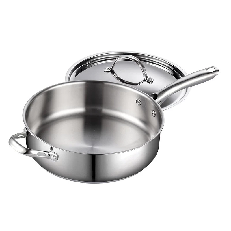 The Cooks Standard Classic 5 Quart/11″ Stainless Steel Deep Saute Pan with Lid is made with stainless steel with an aluminum disc layered in the bottom. The aluminum disc provides even heat distribution and prevents hot spots. Stainless steel lid keeps in heat and moisture, oven safe to 500F. Riveted handles offer durability. Induction compatible. Works on gas, electric, ceramic, glass, etc. Dishwasher safe.