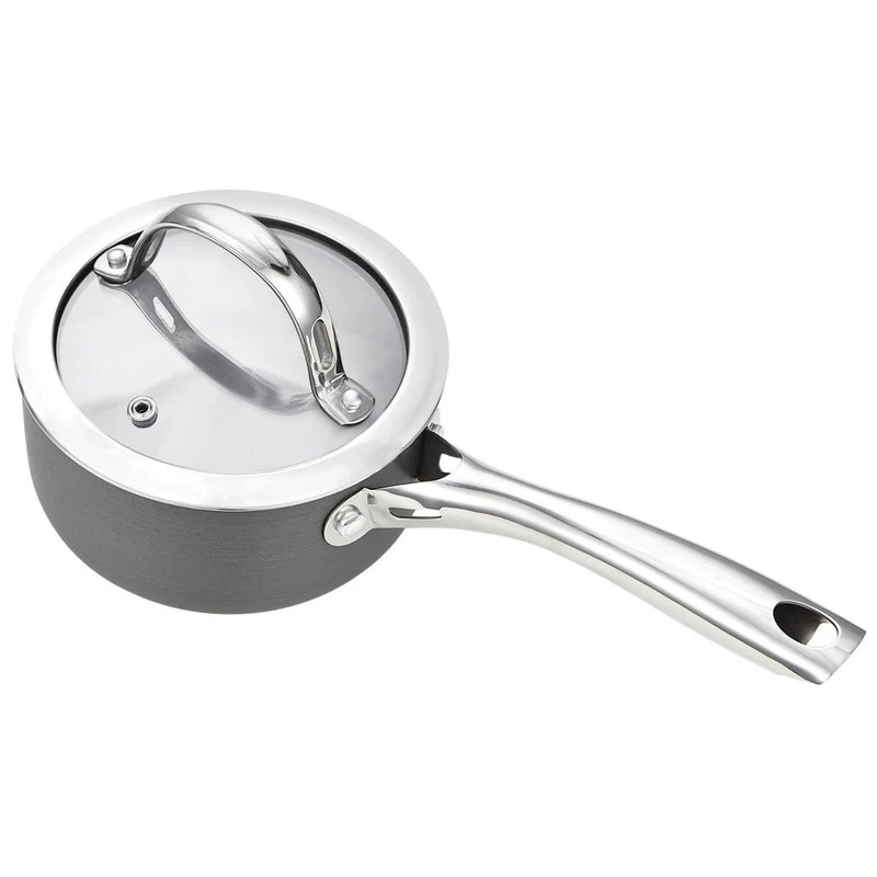 Cooks Standard Hard Anodize Premium Grade Nonstick 1-QT Sauce Pan with Cover, cover is tempered Glass lid, protected by stainless steel rim outside of glass and Ergonomically designed Stainless steel handle, riveted for strength, premium grade nonstick deliver exceptional performance, Heavy gauge aluminum core is super heat distribution without any ” Hot spot”.