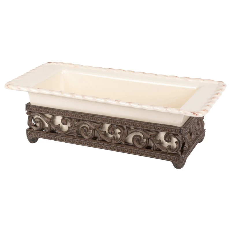 Be the first to review “Cream Stoneware Loaf Dish With Metal Acanthus Leaf Base.” Cancel reply