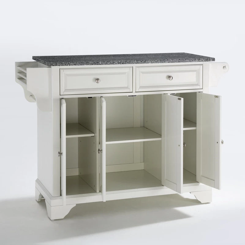 Constructed of solid hardwood and wood veneers, this kitchen island is designed for longevity. The beautiful raised panel doors and drawer fronts provide the ultimate in style to dress up your kitchen. Two deep drawers are great for anything from utensils to storage containers. Behind the four doors, you will find adjustable shelves and an abundance of storage space for things that you prefer to be out of sight. Style, function, and quality make this kitchen island a wise addition to your home.