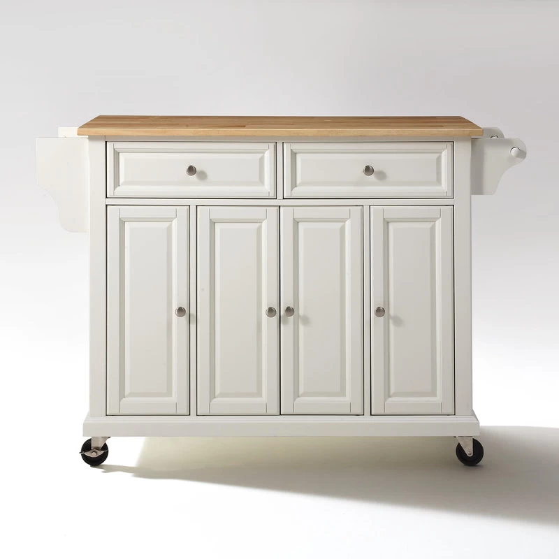 Constructed of solid hardwood and wood veneers, this mobile kitchen cart is designed for longevity. The beautiful raised panel doors and drawer fronts provide the ultimate in style to dress up your kitchen. Two deep drawers are great for anything from utensils to storage containers. Behind the four doors, you will find adjustable shelves and an abundance of storage space for things that you prefer to be out of sight. The heavy duty casters provide the ultimate in mobility. When the cabinet is where you want it, simply engage the locking casters to prevent movement. Style, function, and quality make this mobile kitchen cart a wise addition to your home.