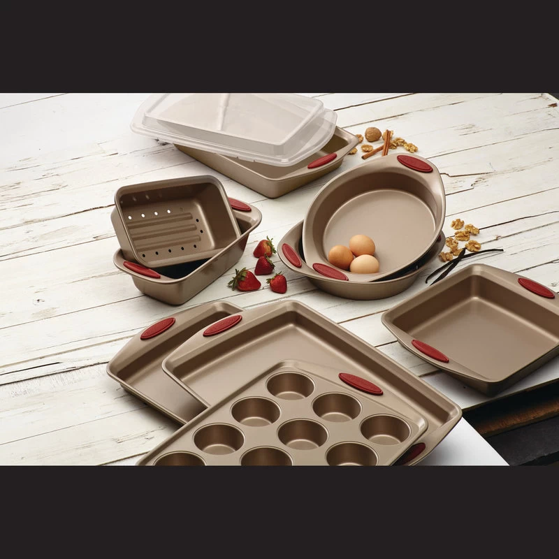 Enjoy easy, delicious roasted and baked foods with the distinctive, durable Rachael Ray Cucina Nonstick Bakeware 10-Piece Bakeware Set in a unique and stylish color.Sturdy carbon steel rolled-rim construction provides dependable baking and roasting performance.