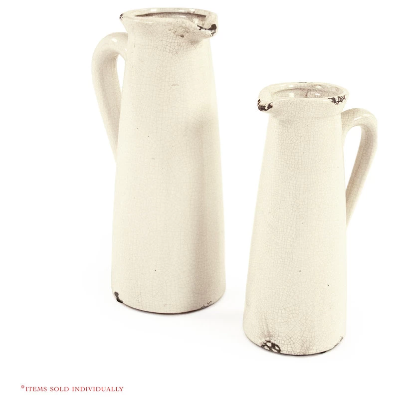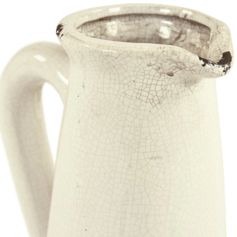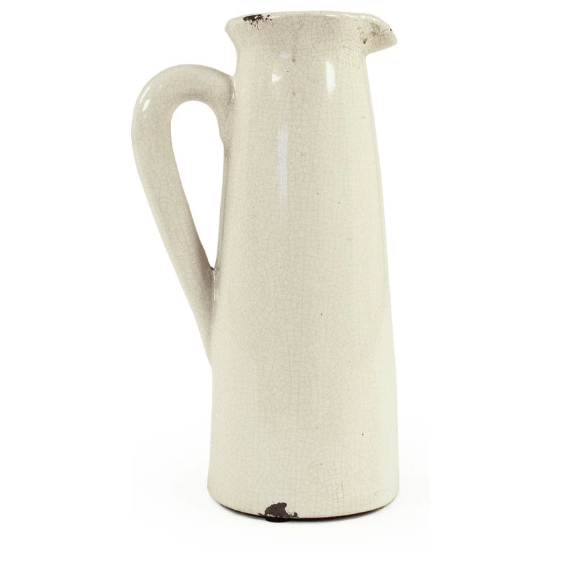 Add a quiet and quaint look to your home with this beautiful ceramic pitcher. This pitcher has thin cone shape that tapers towards the top and flares out at the opening. The pitcher has a curved handle for easy lifting. This item has a beautiful white color with a distressed crackle finish. This adds an old fashioned and country look to this piece. This version is the larger piece.