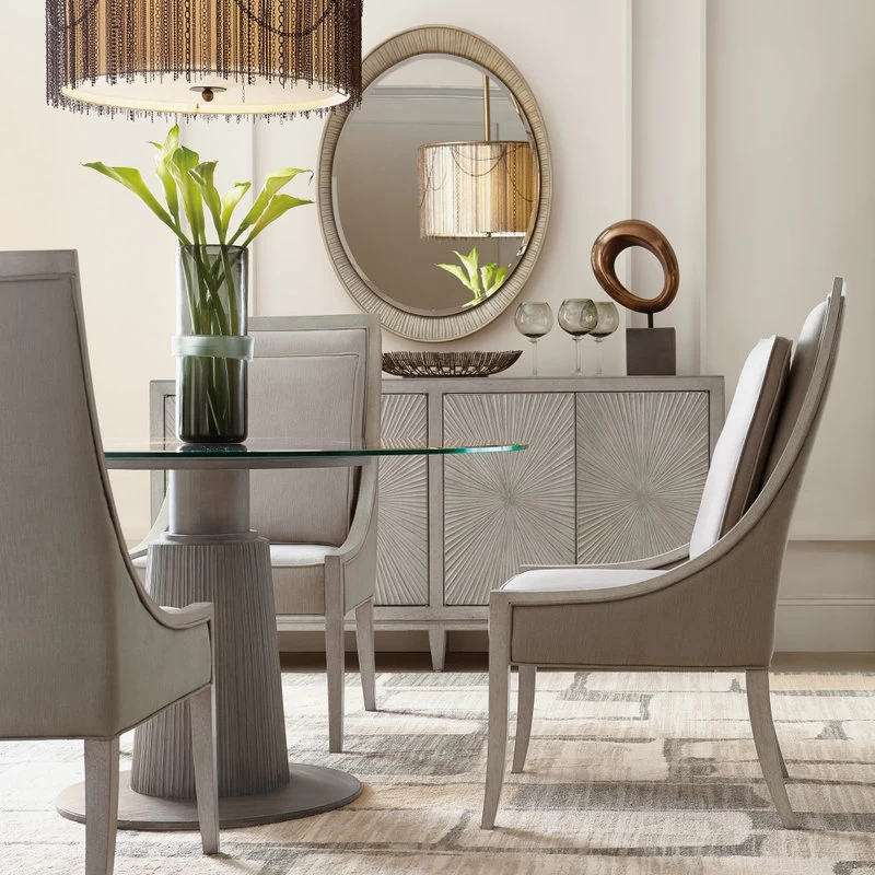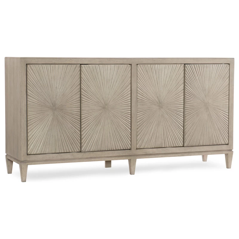 With the stunning textured starburst pattern on the doors, you will want to show off the Elixir Buffet throughout your home. Use it in the hall as an entry piece, in the dining room as a buffet, or use this TV-ready piece in the family room as an entertainment center or console. The 4 doors have touch latches, and there are 2 drawers and 2 adjustable shelves behind each set of doors. Ventilated back panel. Accommodates up to 70-inch flat screen TV.