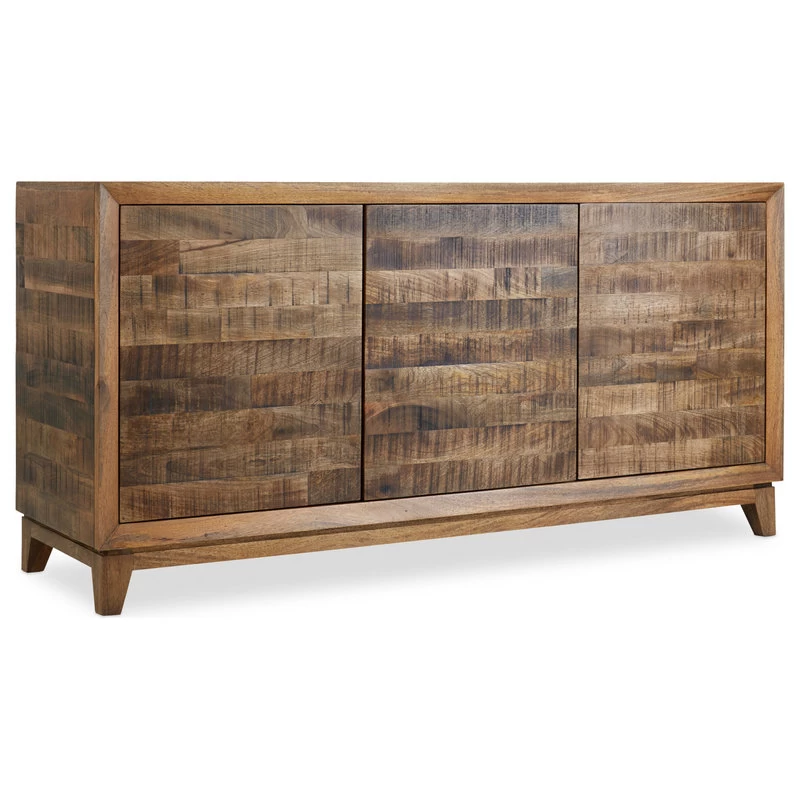 Crafted of Solid Wood Mango with a patterned veneer design and organic color palette, the 64-inch entertainment console offers stylish storage for clutter-free entertainment. Accommodating up to a 65-inch TV, the�piece offers wire management and 3 doors with touch-latch operation. The left side set of doors has a center partition.