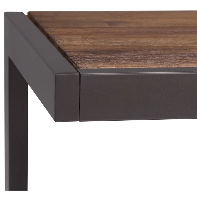 - Features large solid acacia top with open shelf and sturdy matte black metal frame and base