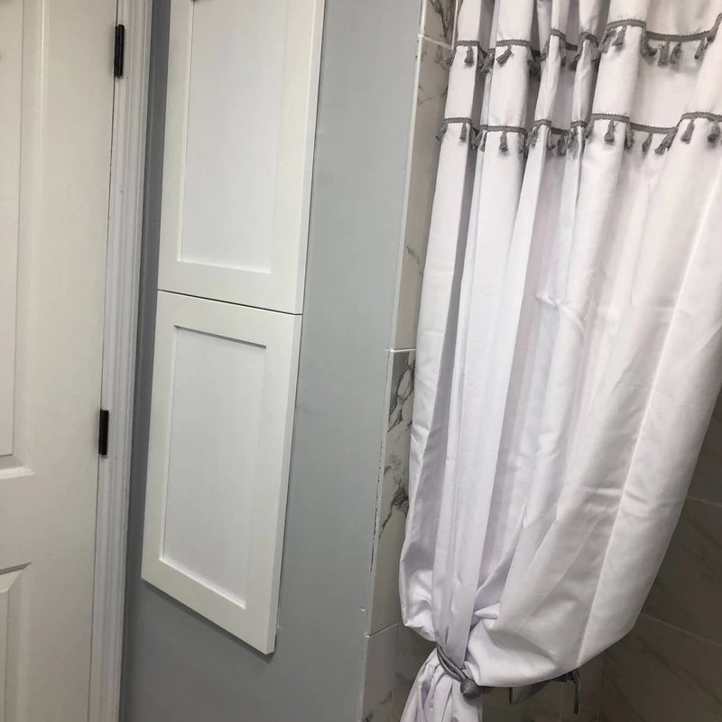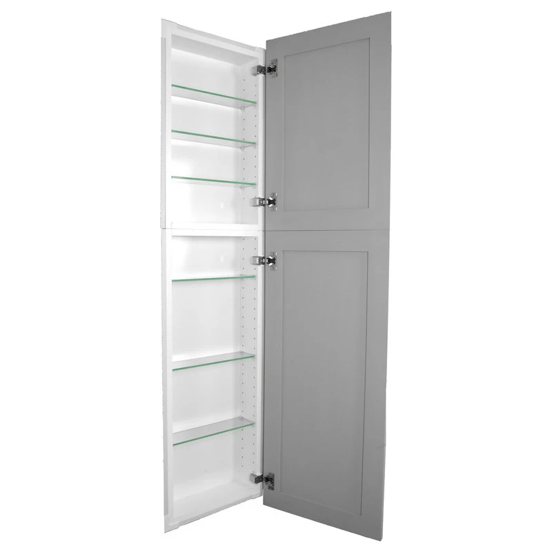 Perfect for any bathroom. Recesses in the wall between the studs, and simply screws to the studs on each side of the opening. Only the doors are outside the wall. Fully adjustable glass shelves inside. Our unique, patented design of shelf supports keeps each shelf in place. Concealed hinges with soft close built in assures the door will never slam shut, but softly close on its own instead. Box is SOLID pine and the Shaker style door is SOLID maple. We’ve painted the inside of the box white, so you don’t have to! The box is 3.5″ deep inside and gives you plenty of usable depth, but fits in standard 2×4 walls. This model has TWO doors which open to reveal two separate cabinet sections. Cabinet box is 12.5″ wide inside. Doors are reversible to open either Left or Right. Completely assembled! All you need to do is put one screw in each hinge to mount the door. Then insert it in the wall and screw it to the studs with included screws. If you are replacing a current cabinet, measure your wall opening! White plastic trim surround covers the rough edges of your opening up to 1/2″ all around. Doors cover the trim surround when closed so the only thing you see outside the wall are the doors. Made in Sarasota, FL. The door comes in three variants:
