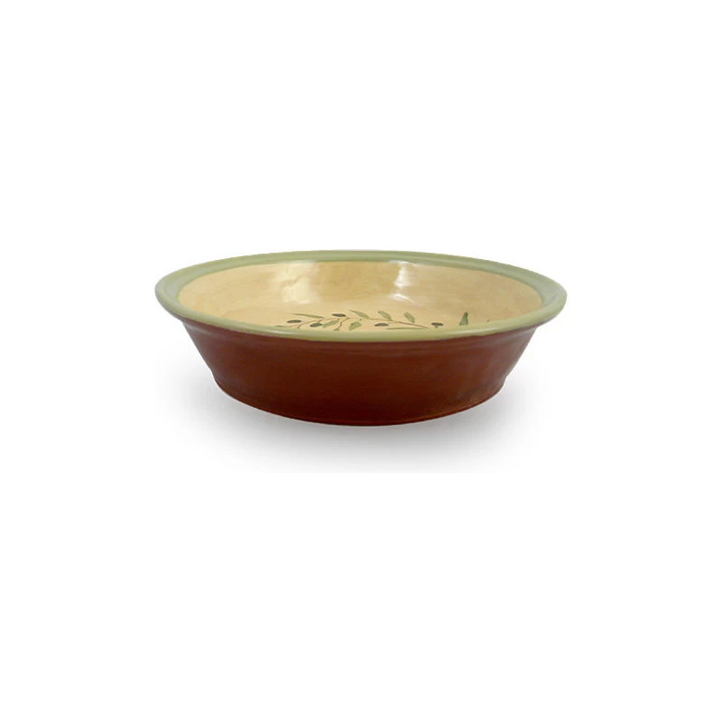 With a full 9.5″ interior diameter (10.5″ exterior diameter) x 2″ deep, the versatile deep-dish pie plate is ideal for your large pastry, dessert pie, quiche, or gratin! The Mediterranean-inspired motif features a lovely hand-painted olive branch atop a warm tan background, providing a beautiful accent in the kitchen. The terra-cotta pie plate is safe for the dishwasher, oven, and microwave.