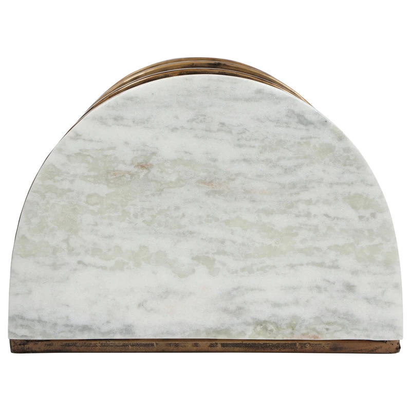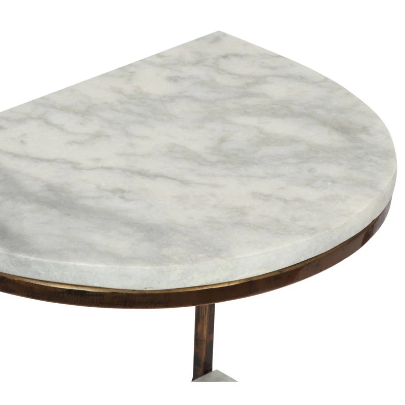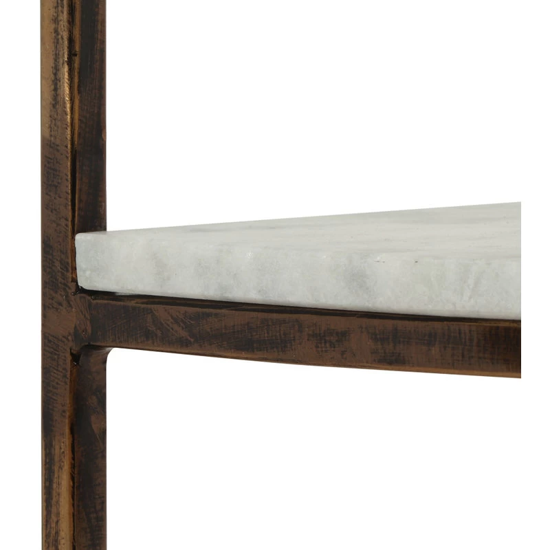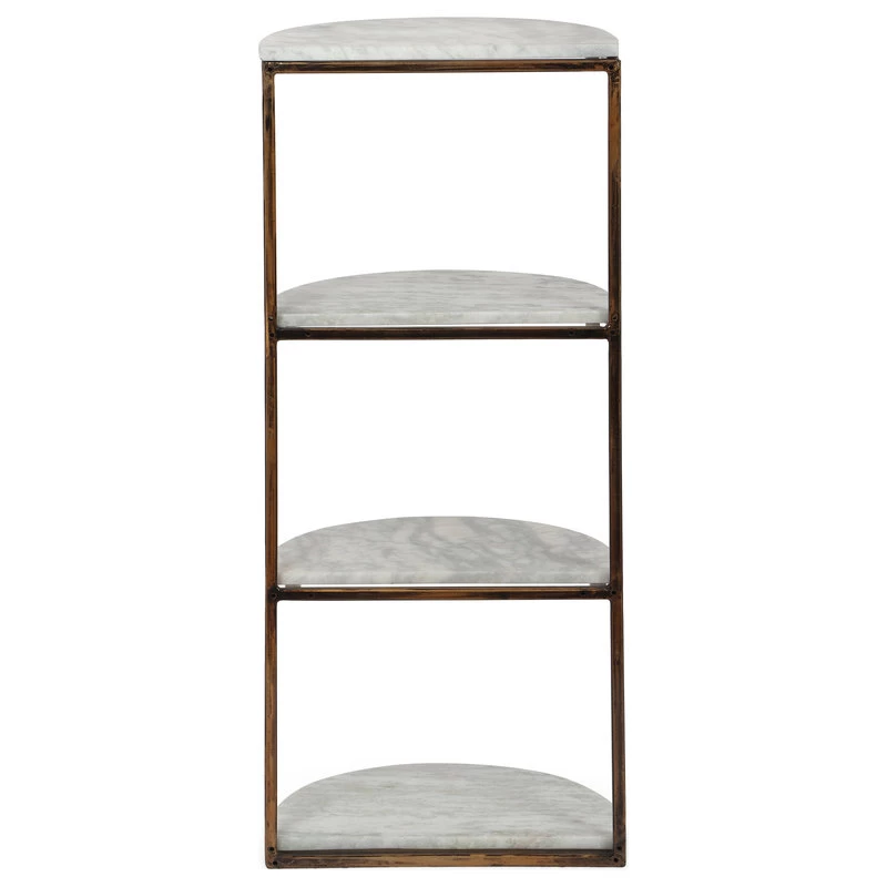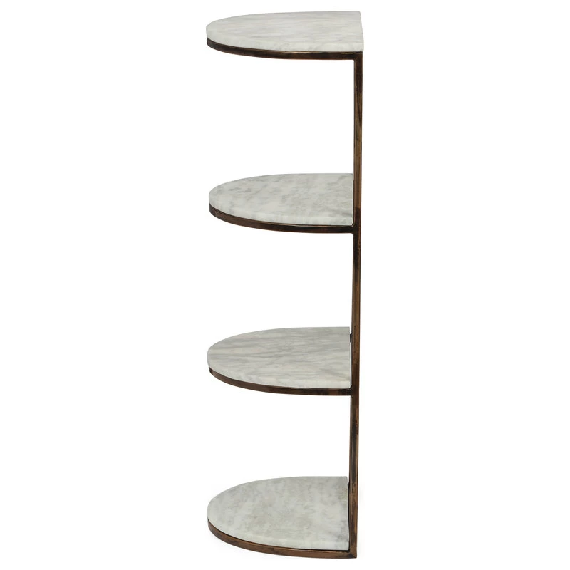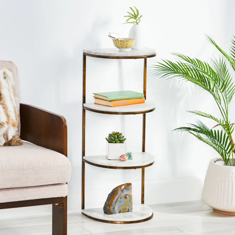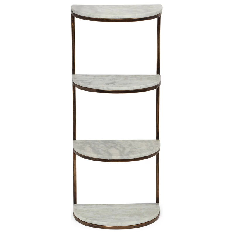 Maximize your interior space with an accessory that brings a graceful charm to your decor. Featuring an elegant modern glam design, our four-shelf bookcase can be situated against any wall of your home. This is finished with beautiful marble shelving that is supported by a highly durable structure to ensure the best stability for your space. Finished with a stunning antique brass colored frame, this piece offers four sturdy shelves that provide ample space for display and organization, allowing you to easily personalize your home.MODERN GLAM: Our bookcase showcases a dazzling metallic frame and stunning marble veining that pair seamlessly with elegant curves for a luxurious modern glam look. Complemented with a minimalistic half-round structure, this bookcase brings a sleek touch to any decor.HANDCRAFTED DESIGN: This accessory is expertly designed and handcrafted with artisan expertise. Any natural variations are not product flaws, but rather, will ensure that your purchase is truly a one-of-a-kind product.HALF ROUND ETAGERE DESIGN: Featuring open shelves for a clean, spacious look, our etagere bookcase is designed to exhibit a collection of ornaments. This offers an elegant half-round design that allows you to place this against any wall of your interior space, allowing you to maximize your organizational capacity.FOUR MARBLE SHELVES: This bookcase comes with four beautiful marble shelves which add to its gorgeous glam design. The shape, color, and density of the veining are natural to stone shelving and will vary from slab to slab.DIMENSIONS: Choose an accessory that is the perfect size for you and your furniture. This bookcase is 14.00″W x 10.00″D x 33.50″H. You will love how much your space can transform with the simple addition of this charming corner bookcase.