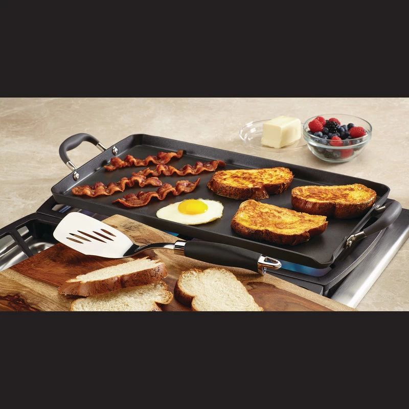 The list of favorite dishes to cook on the Anolon Advanced Hard-Anodized Nonstick 18-Inch x 10-Inch Double Burner Griddle is just as large as the griddle itself. And with a convenient Anolon Tools Stainless Steel Mini Turner included, gourmet cooking is set to go! Ideal for creating buckwheat blinis and strawberry pancakes as well as fig and prosciutto paninis and crisp applewood-smoked bacon, this versatile griddle extends over the length of two stovetop burners to provide ample cooking space to create a feast. Heavy-duty, hard-anodized construction ensures efficient, balanced heat distribution for exceptional gourmet cooking performance. The cookware’s three layers of PFOA-free premium-quality nonstick surface is metal utensil safe and provides exceptional food release, making it ideal for easy cleanup. And a convenient corner spout allows unwanted fats and liquids to be poured off with ease. Dual-riveted Anolon SureGrip handles feature rubber over stainless steel to provide a sturdy and comfortable grip, and the mini turner included is dishwasher safe. Oven safe to 400 Degrees, this versatile double burner griddle coordinates well with other pieces in the Anolon Advanced collection.