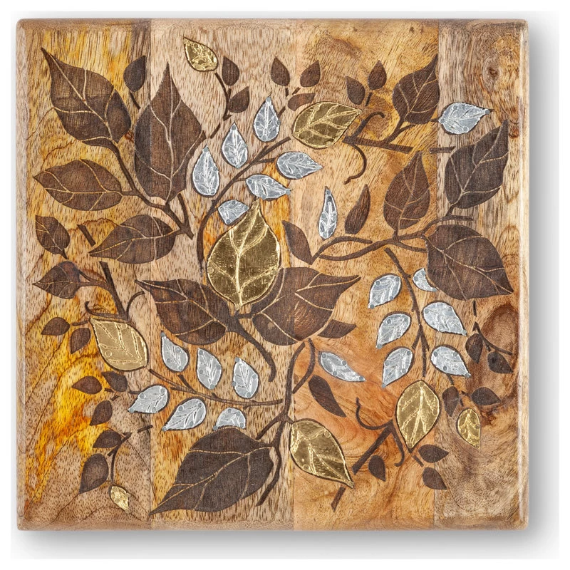 Our square mango wood trivet with two-color leaf inlay with laser design is the perfect companion to your home cooked meals. The mixed metals are gorgeous together and coordinate with all of todays metal tones.