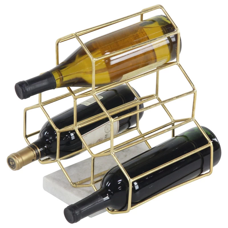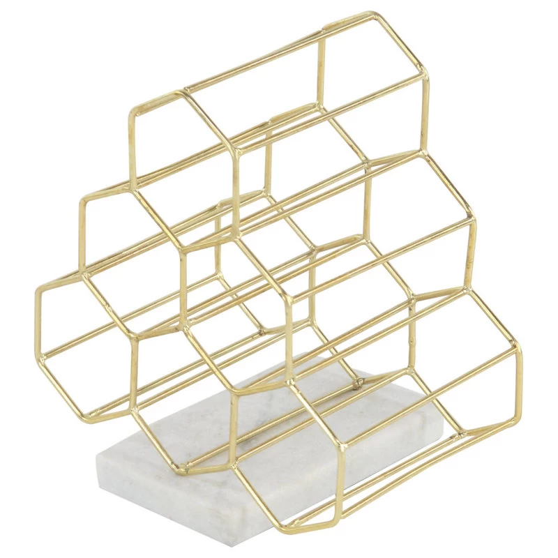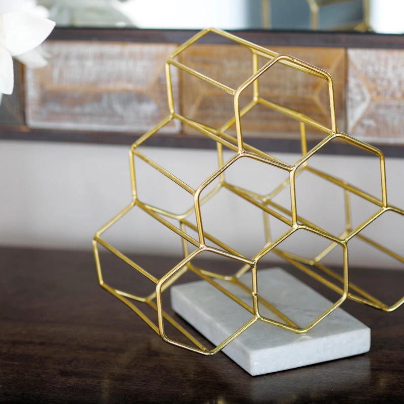 Display and organize your wine bottles with this gold finished honeycomb wine bottle rack displayed on your tables. This item ships in 1 carton. Suitable for indoor use only. Maximum weight limit is 10 lbs. Made in India. This is a single wine rack. Modern style. Gold wine rack can hold 6 average wine bottles.