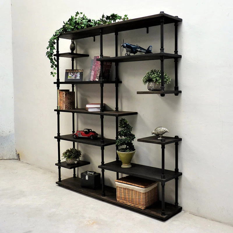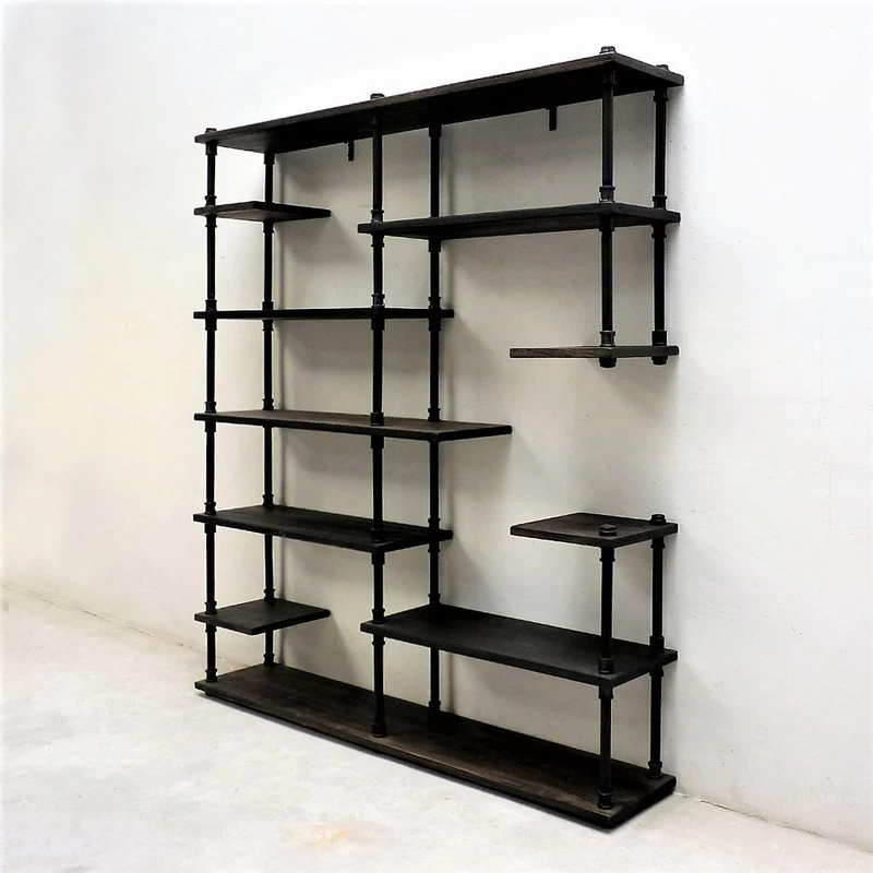 Nashville Industrial Mid-Century 64-Inch Wide Large Open Etagere 11-Shelf Pipe Bookcase Metal With Reclaimed Wood Finish: MOO1-BL, BL, BL.