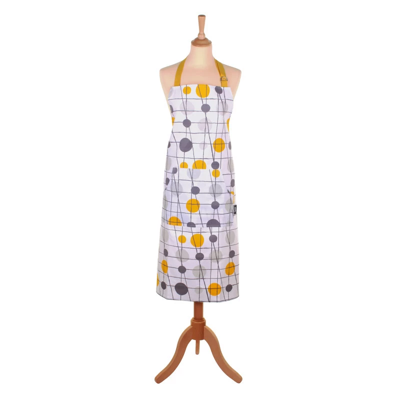 A cotton apron featuring the Mini Moderns Pavilion design. The abstract lines and dots are inspired by the Festival of Britain’s Abacus masking screen, designed by Edward Mills and the Transport Pavilion by Rodney James. This apron has adjustable neck strap and waist ties along with a front pocket.