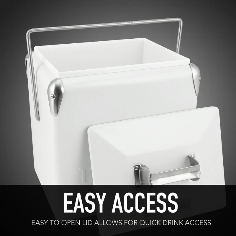 This essential White 14-quart portable handheld picnic cooler refreshes food and beverage for those on the go road trips, picnics or simple entertaining guest. The steel constructed cooler is equipped with a bottle opener, so you won’t have to worry about finding one or carrying one. The cooler handle is uniquely designed to make it easy to carry