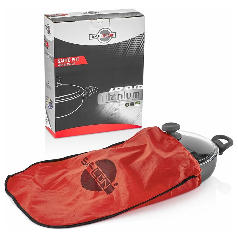 - BONUS GIFT: Easily store nonstick titanium saute pot in a bonus storage bag and enjoy a 30-day money back satisfaction guarantee.