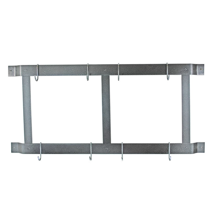 The Ultimate Wall-Mounted Pot Rack is the ideal storage tool for a modern kitchen. Made from hammered steel with chrome hooks, this wall rack is durable and sturdy. Use it to hang everything from utensils to small pots, cookware, and even lids. Includes mounting hardware and eight hooks. Can be hung either vertically or horizontally.