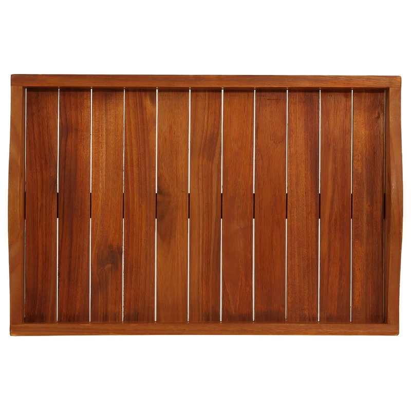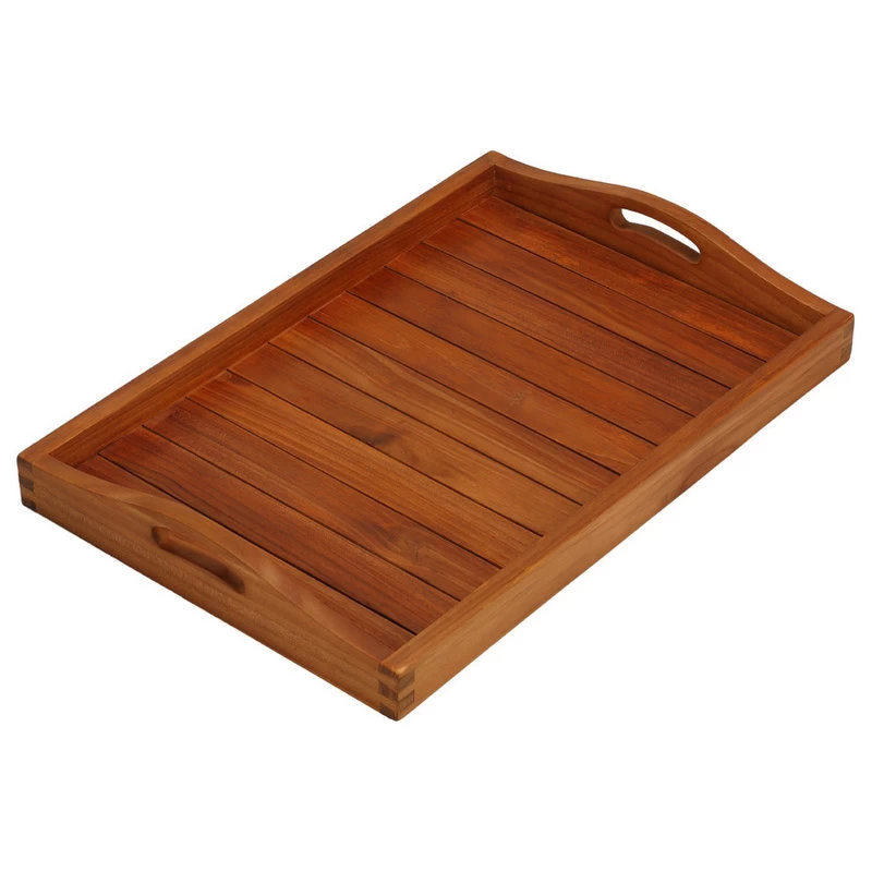 The Vivi rectangular serving tray is as versatile as it is beautiful in a teak oiled finish. Use this on a large ottoman as a coffee table or a serving tray for your outdoor needs with its easy grip handles. Can also be used as a display for towels and spa toiletries in residential or commercial spaces. Made of responsibly harvested solid teak wood (tectona grandis), it is naturally resistant to mold and mildew and is outdoor friendly.