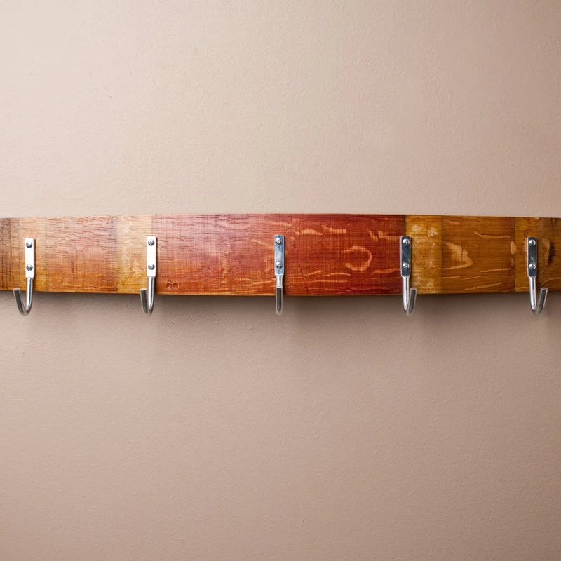| Materials | Reclaimed Oak Wine Barrel Stave, Steel Barrel Bands, Lacquer, Stainless Steel Hooks, Screws, Oak Plu |