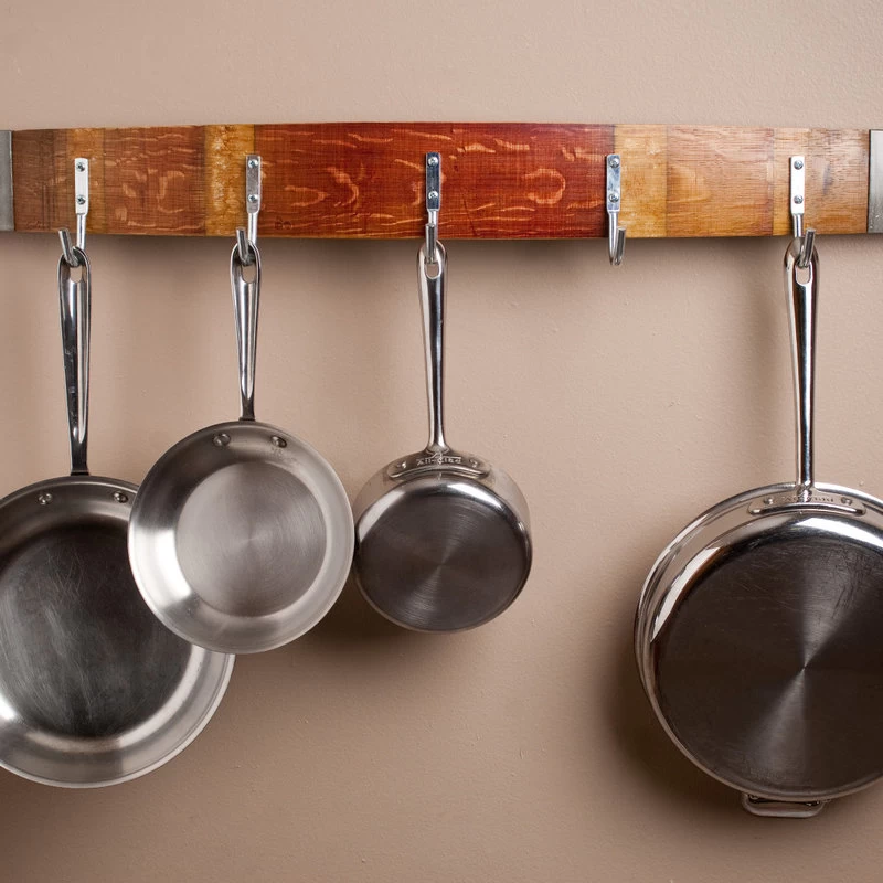 This beautiful Pot Rack, created from a distinctive Napa Valley wine barrel stave, does more than save space in your kitchen. The unique variations in wood grain, stain, and the patina of age add a warm, stylish touch of wine country to your home. Features five stainless steel hooks and barrel band accents. Approximately 36″ long x 3″ high. Limited hardware is provided, pots are not included. Artisan-crafted in Colorado.