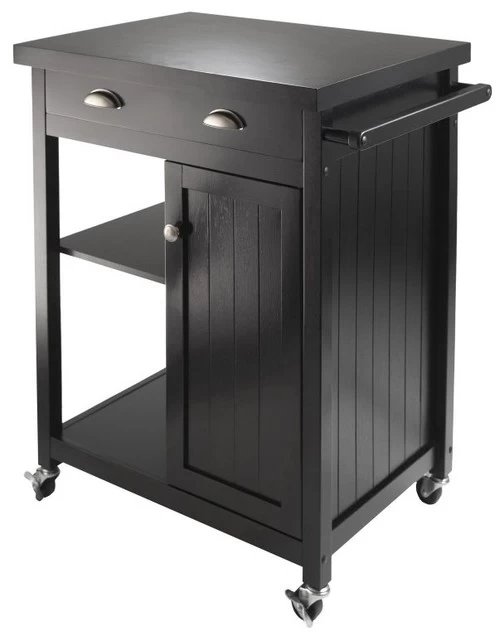 The Timber Kitchen Cart with wainscot panel and finished in black compliments your kitchen very nicley. Top surface working area is 25.6W x 19.3D. One large drawer with inside dimension of 20.7W x 13.5D x 2.75H. One side has open storage with one adjustable shelf. The other bottom half has closed cabinet with one adjustable shelf. Inside cabinet size 10.5W x 15.6D x 22.2H (without shelf). Made of combination solid and composite wood. Ready to assemble.