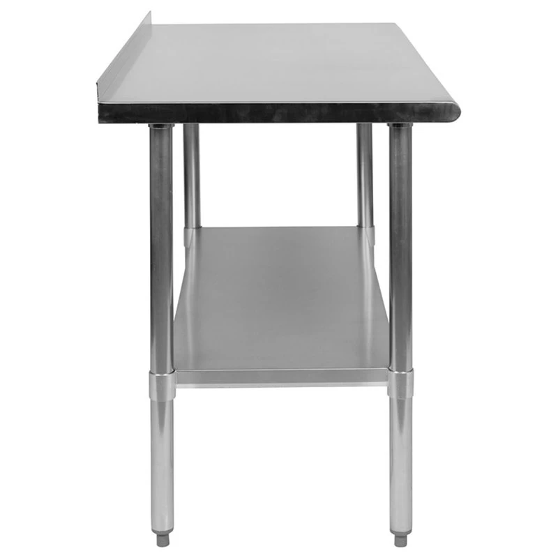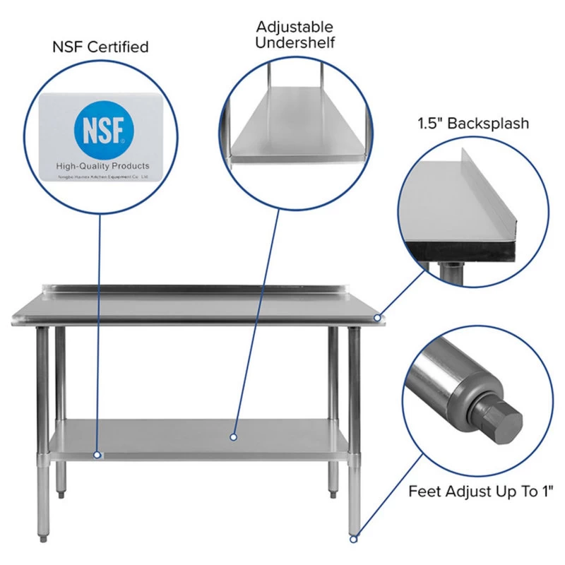 - Rust Resistant Stainless Steel Commercial Kitchen Prep Table with Adjustable Undershelf and 1.5″ Backsplash. NSF Certified to help reduce the chance of foodborne illness. 18 Gauge Steel Table holds up to 600 pounds, Undershelf holds up to 200 pounds. Rounded Corners prevent accidental injuries. Adjustable Feet are movable up to 1″ to maintain a level work surface.